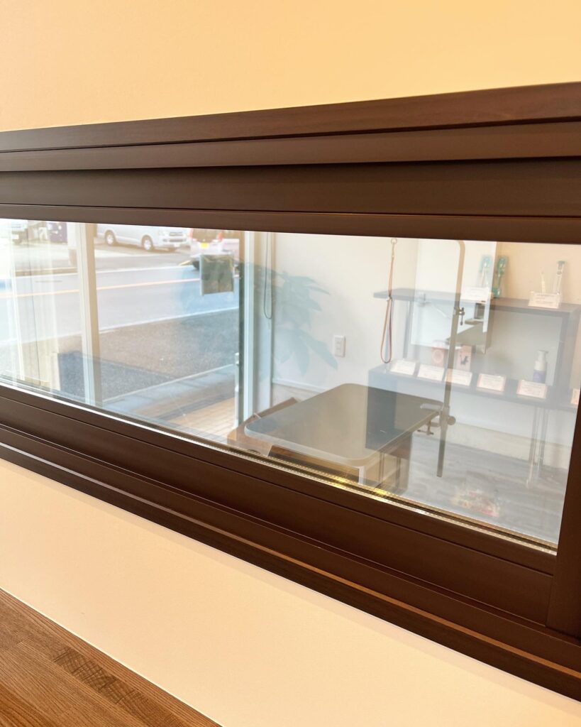 座った時に顔の高さにくるガラス窓からは、トリミング室の様子をご覧いただけます。